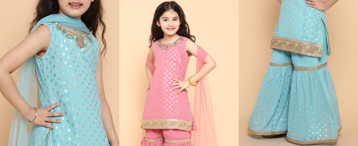 AJ DEZINES Girls Sharara Kurta Set | Georgette Sleeveless Kurti Set | Ethnic Wear for Girls | Foil Printed Sharara Suit | Stylish Kids Kurta for Festivals Weddings & Special Occasions