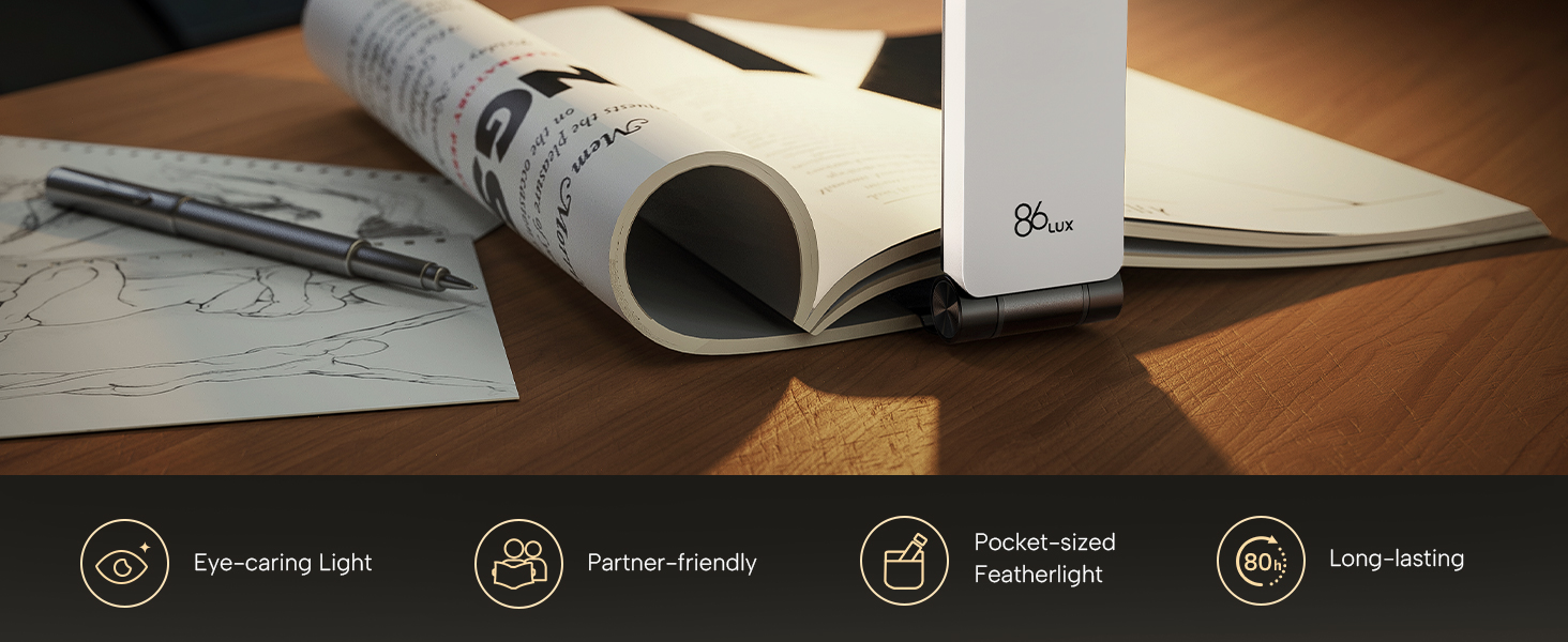 86lux Reading Light, Rechargeable Reading Light, Ultralight LED Light with 3 Amber Colors and Stepless Dimming for Night Reading for Book Lovers, Kids, White