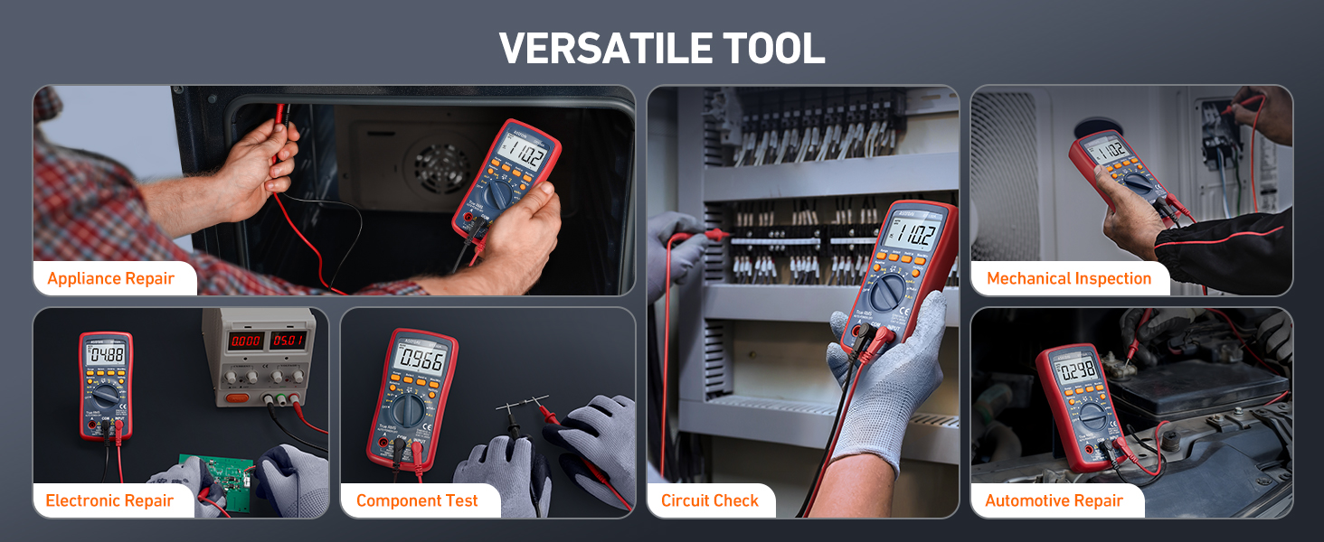 The AstroAI Digital Multimeter offers 4000 counts of True RMS accuracy with both manual and auto-ranging modes. It supports comprehensive testing including voltage, current, resistance, continuity, capacitance, frequency, diodes, and temperature. Designed for professionals and serious DIYers, it features a large backlit display, data hold, kickstand, and a rugged build to withstand commercial use.